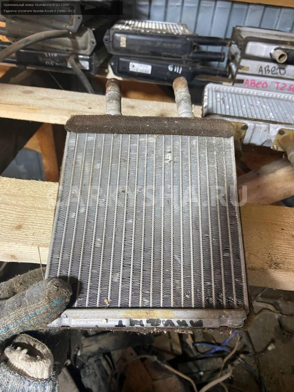 Hyundai Accent тагаз, радиатор печки.\nАртикул: 4107\n\nОриг. номер: Hyundai-Kia 9722122000\nПроизводитель: Hyundai-KIA\nПримечание:Хендай Акцент тагаз, радиатор печки, б/у. \n\nМарка: Hyundai\nМодель: Accent II (1999—2012)\nСовместимости: Hyundai Accent II (1999—2012)\nСовместимость: