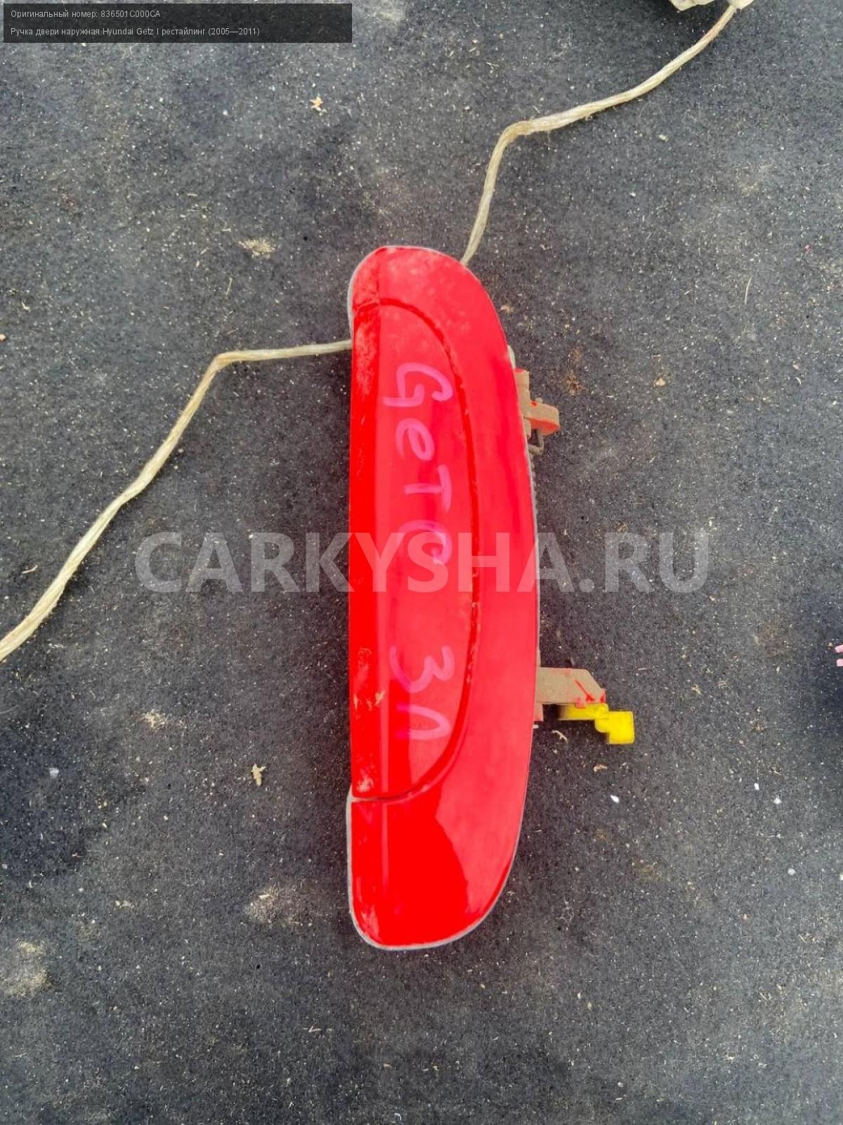 Hyundai Getz, ручка двери задняя левая наружная\nАртикул: 4540\n\nОриг. номер: 836501C000CA\nПроизводитель: Hyundai-KIA\nПримечание:Хендай Гетц, наружная ручка двери задняя левая, бу. \n\nМарка: Hyundai\nМодель: Getz I рестайлинг (2005—2011)\nГод выпуска: 2007\nКузов тип: Хетчбэк\nДвигатель номер: G4EE\nМодель двигателя: инжектор\nОбъем: 1.4\nТопливо: Бензин\nКоробка: Механика\nЦвет: Красный\nПраво/Лево: Лево\nПеред/Зад: Зад\nСовместимости: Hyundai Getz I рестайлинг (2005—2011) 1.4 MT (97 л.с.)\nСовместимость: