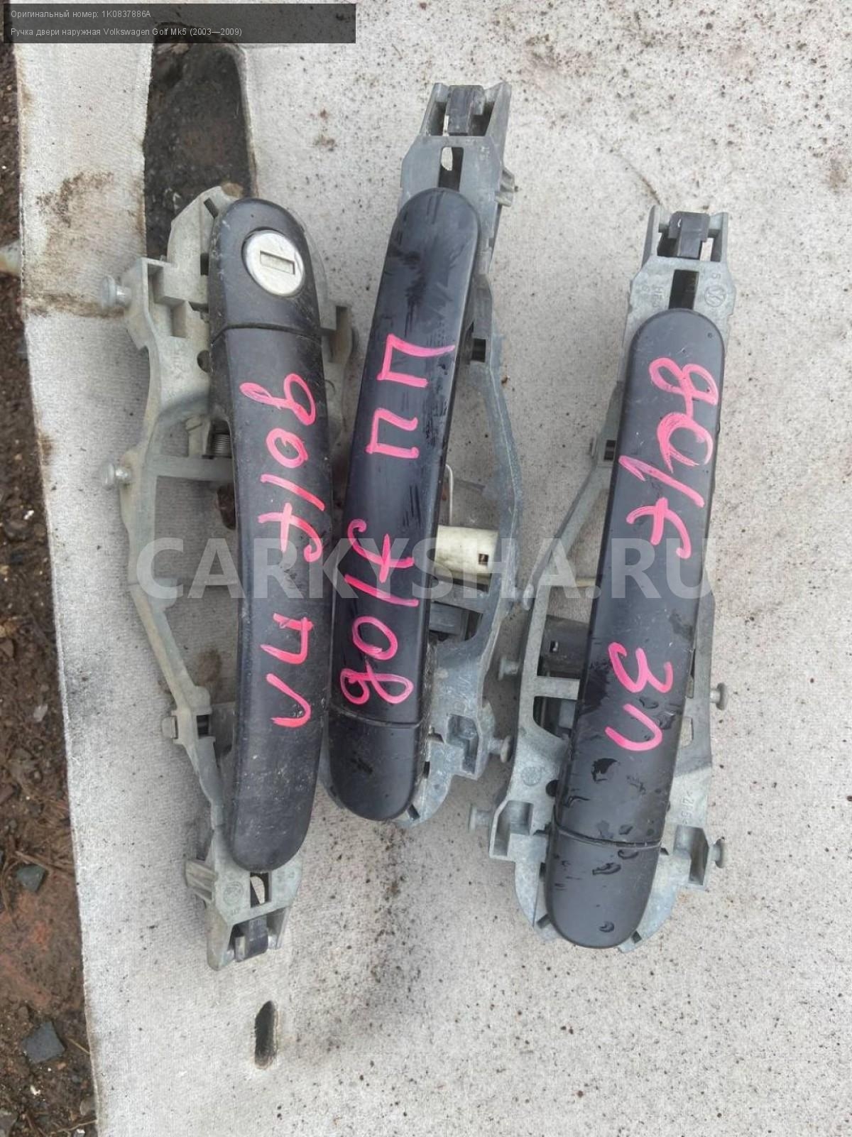 Volkswagen Golf 5, ручка двери левая задняя\nАртикул: 3533\n\nОриг. номер: 1K0837886A\nПроизводитель: VOLKSWAGEN\nПримечание:Фольцваген Гольф 5, ручка двери наружная,осталась задняя левая, б/у, \n\nМарка: Volkswagen\nМодель: Golf Mk5 (2003—2009)\nГод выпуска: 2008\nКузов тип: Хетчбэк\nДвигатель номер: BSE\nМодель двигателя: инжектор\nОбъем: 1.6\nТопливо: Бензин\nКоробка: Механика\nЦвет: Черный\nПраво/Лево: Лево\nПеред/Зад: Зад\nСовместимости: Volkswagen Golf Mk5 (2003—2009) 1.6 MT (102 л.с.)\nСовместимость: