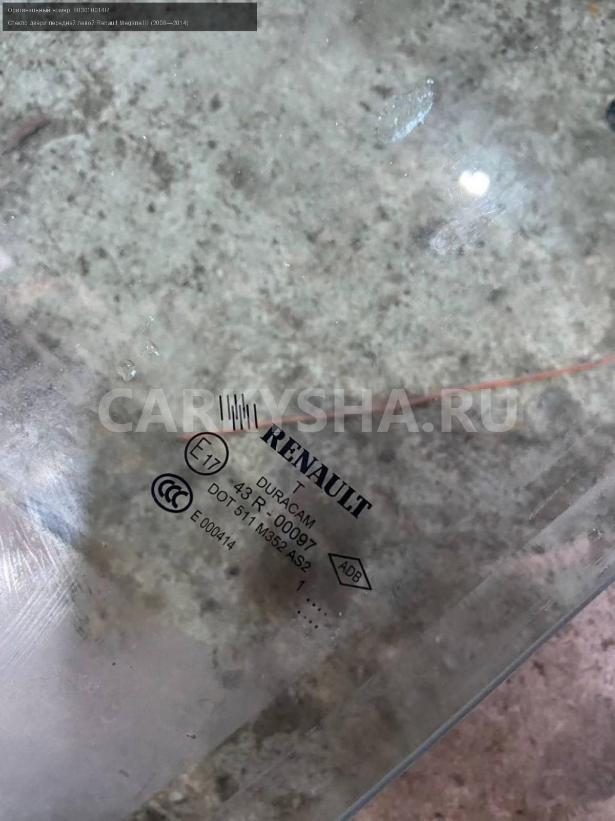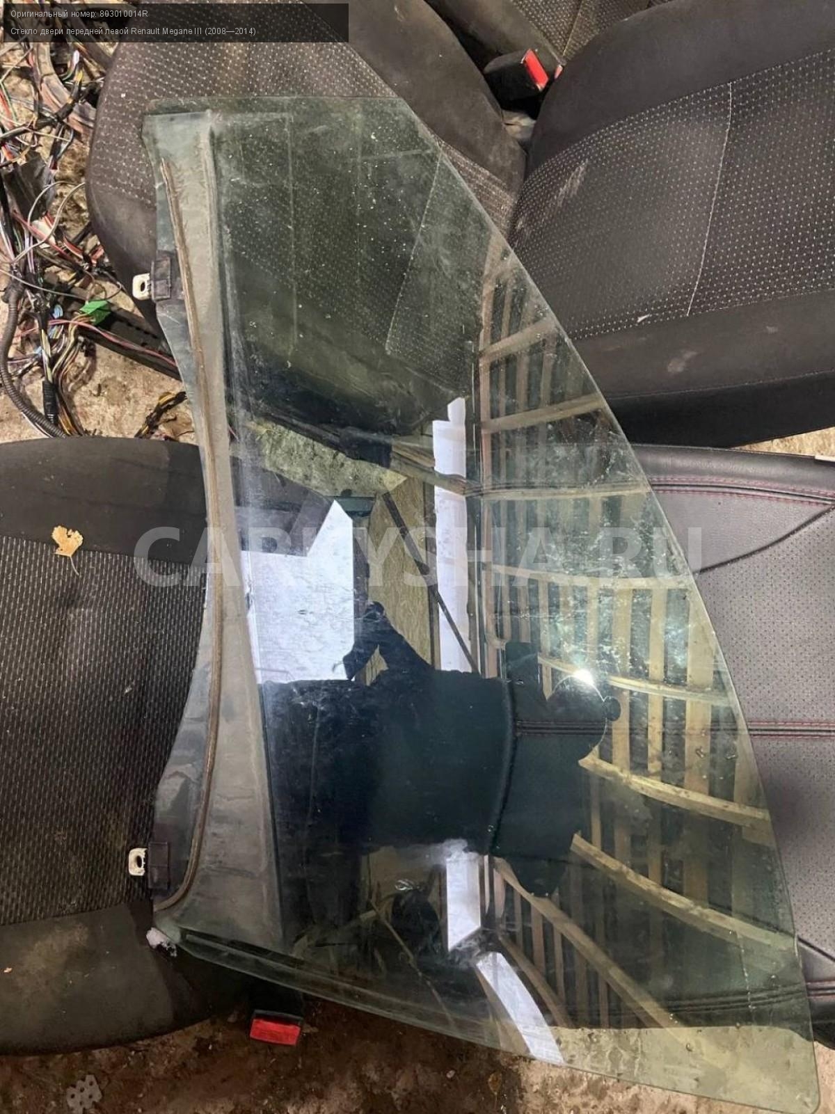 Renault Megane III, стекло двери передней левой.\nАртикул: 6655\n\nОриг. номер: 803010014R\nПроизводитель: RENAULT\nПримечание:Рено Меган 3, стекло двери передней левой, б/у. \n\nМарка: Renault\nМодель: Megane III (2008—2014)\nГод выпуска: 2011\nКузов тип: Хетчбэк\nДвигатель номер: K4MV838\nМодель двигателя: инжектор\nОбъем: 1.6\nТопливо: Бензин\nКоробка: Механика\nЦвет: Темно-Серый\nПраво/Лево: Лево\nПеред/Зад: Перед\nСовместимости: Renault Megane III (2008—2014) 1.6 MT (106 л.с.)\nСовместимость: